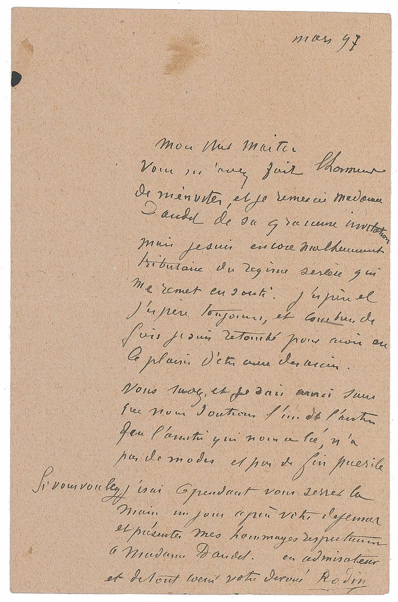 ALS in French, signed “Rodin,” one page, 4.25 x 6.5, March 1897. Letter to the novelist Alphonse Daudet. In part (translated): "You did me the honor of inviting me, and I thank Mrs. Daudet for her gracious invitation but I am unfortunately dependent on a strict diet due to my health. I hope and I still hope, and how many times I fell for the pleasure of being with friends. You know and I know as…the friendship that has bound us, has no childish ways and no end.” In fine condition, with uniform toning and a small stain at the top. Rodin had been friends with Daudet for nearly two decades, the latter remaining especially supportive of his work during his famously controversial commissions of the late 1890s. He even occasionally turned to his friend for inspiration, as the writer Jules Renard once heard Rodin, contemplating titles for his works, ‘naively asking Daudet what he should call these astonishing creations he had made.’ A fine association piece between two French artistic greats.