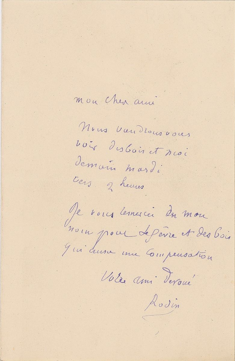 Neatly penned ALS in French, signed “Rodin,” one page, 4 x 6.25, no date. An interesting letter thanking a patron for obtaining a commissioned work for Rodin and for his pupils Camille Lefevre and Jules Debois. In full (translated): "Desbois and myself would like to see you tomorrow Tuesday around two. I thank you for recommending me and Lefevre and Desbois, who will be rewarded.” In fine condition.