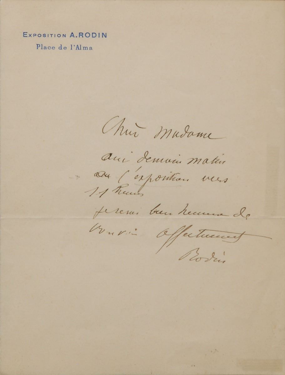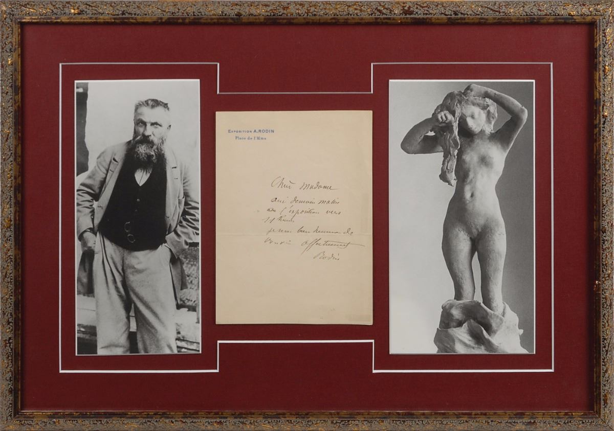 Untranslated ALS in French, signed “Rodin,” one page, 5.25 x 7, Exposition A. Rodin letterhead, no date. Archivally mounted, matted, and framed between two images to an overall size of 20.5 x 14.5. In fine condition, with two pieces of tape on the reverse lightly showing through along the right edge. Pre-certified PSA/DNA.
