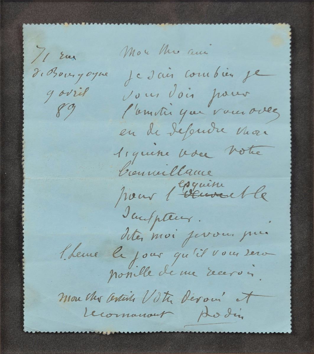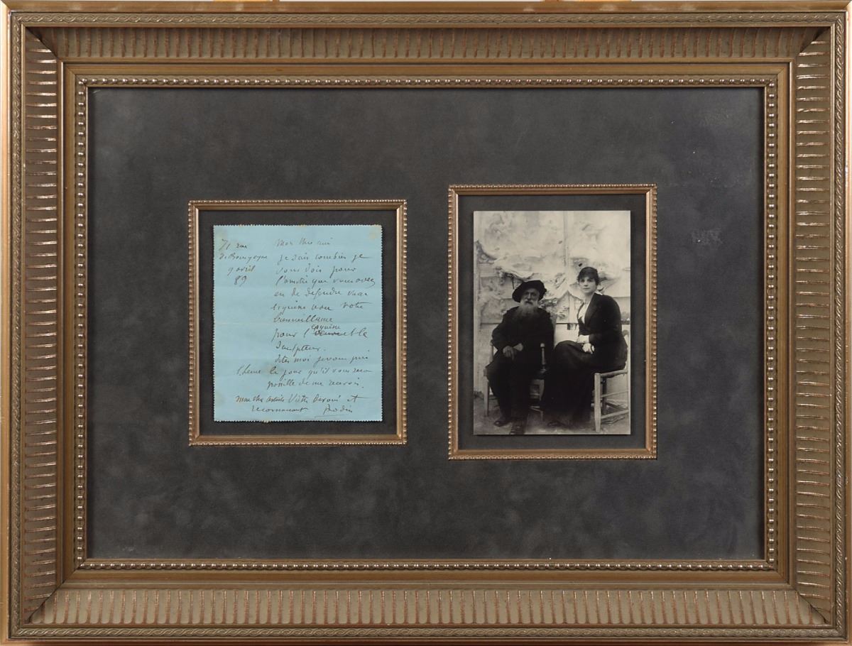 Untranslated ALS in French, signed “Rodin,” one page, 4.5 x 5, April 9, 1889. Handsomely matted and framed with a picture of Rodin sitting with a woman to an overall size of 22 x 16.75. In very good to fine condition, with scattered creasing and a few small stains.