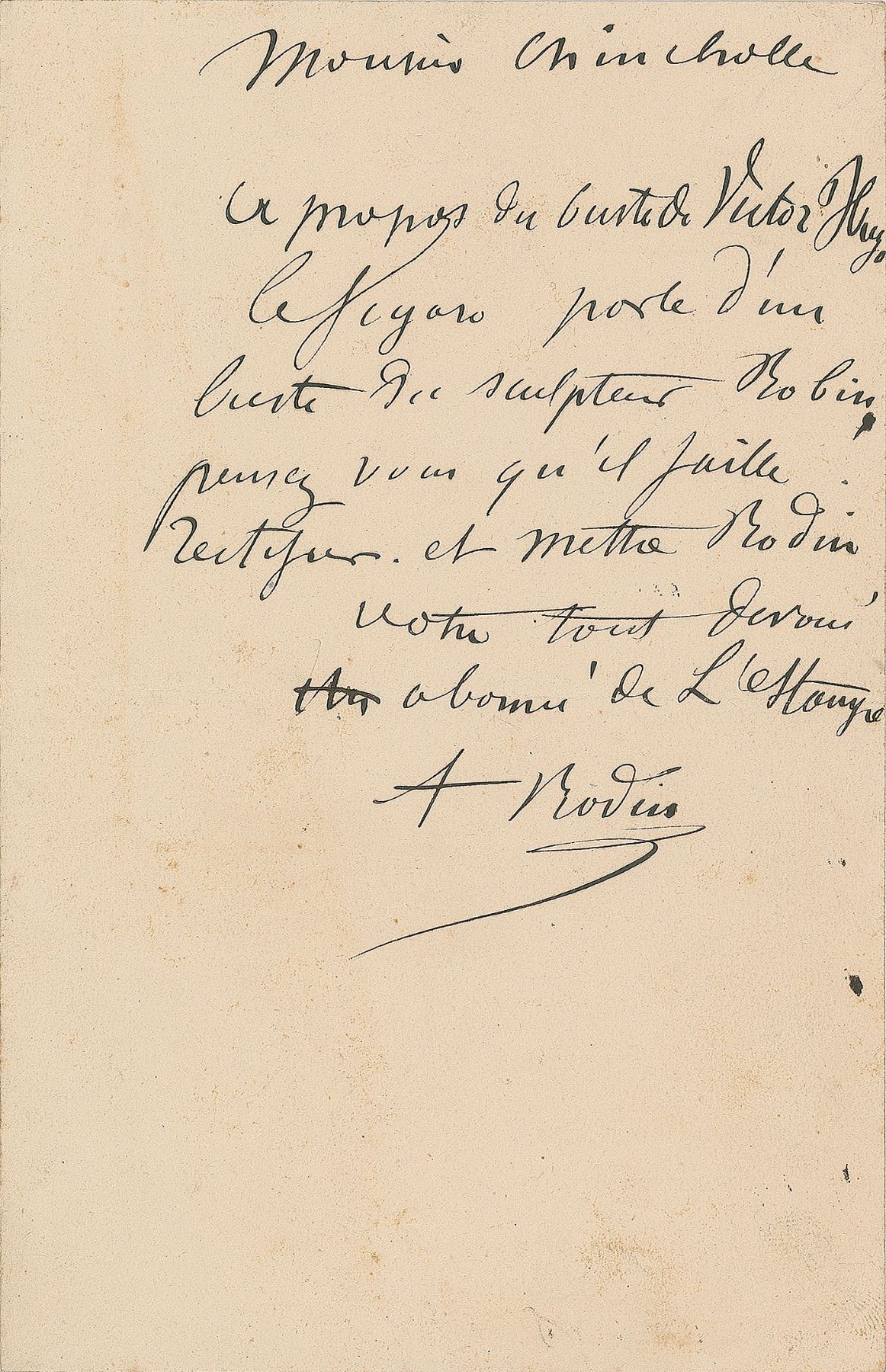 ALS in French, signed “A. Rodin,” one page, 4.5 x 7, no date. Letter to newspaper publisher Charles Chincholle, the founder of the newspaper L'estampe. In full (translated): "Speaking of the bust of Victor Hugo, Le Figaro speaks of a bust by the sculptor Robin. Do you believe it should be rectified and corrected to Rodin? I am your devoted friend and a subscriber of L’estampe." In fine condition, with light overall soiling. In 1883, the journalist Edmond Bazire advised Rodin to make a portrait of a famous man to help establish his own reputation. He introduced the sculptor to Victor Hugo, who refused to pose at sittings, but invited Rodin into his home on the Avenue d’Eylau and allowed him to make a few drawings. Rodin unveiled his model for a bust of Hugo at the Salon of the Societe des Artistes Francais in 1884, and in 1889 was commissioned for the Palais Royal monument to Victor Hugo. A fascinating and amusing letter from the then little-known sculptor.