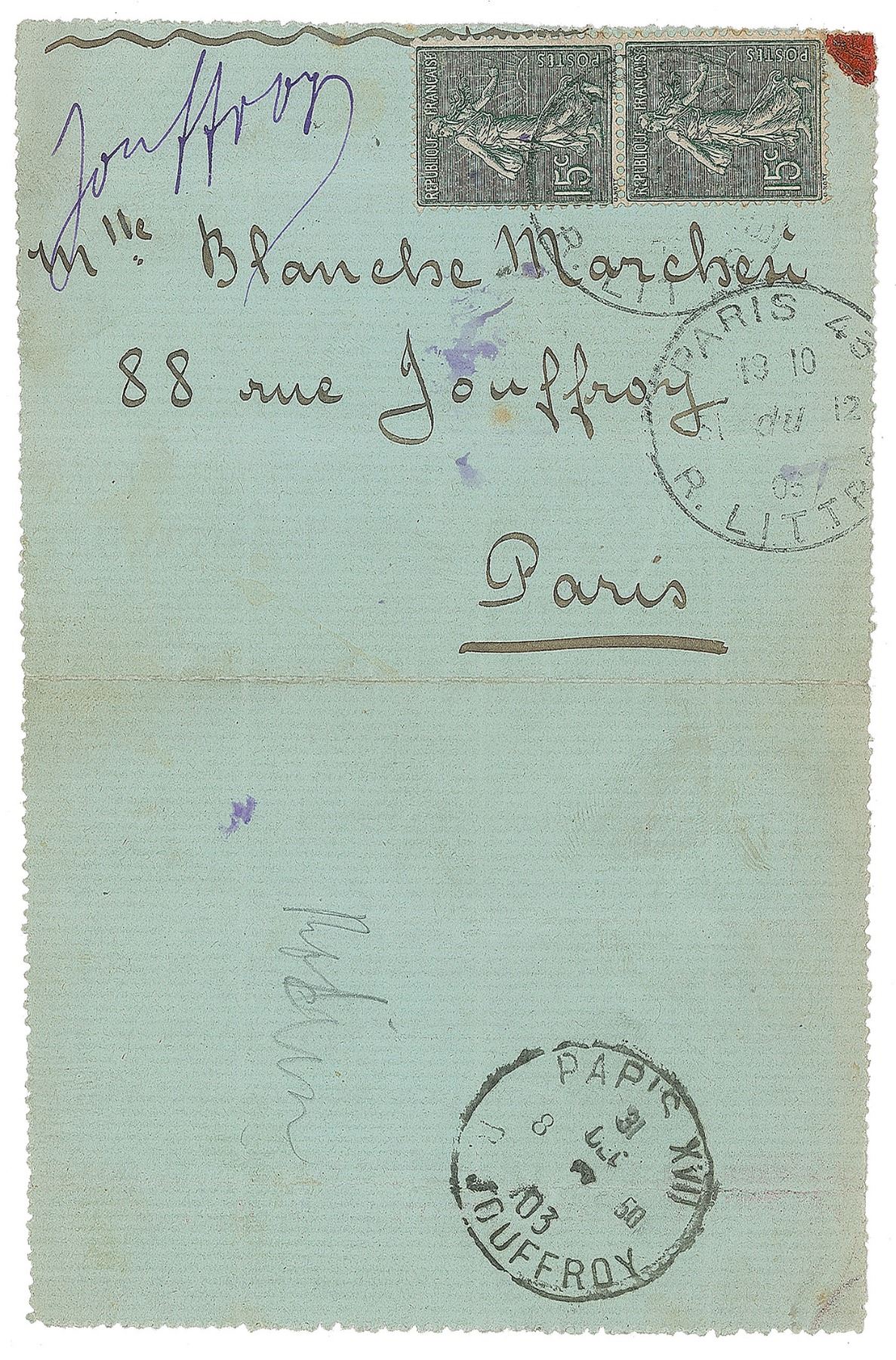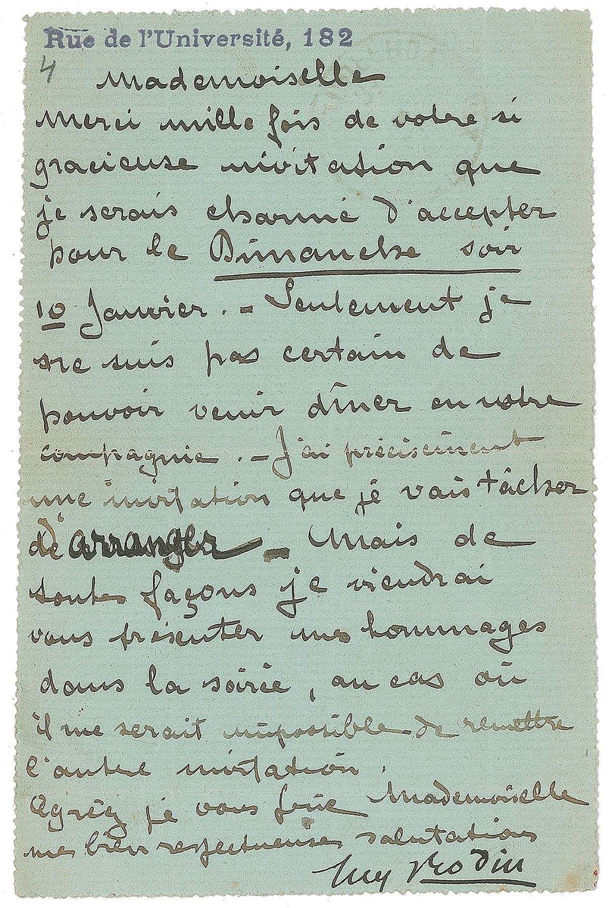 LS in French, signed “Aug. Rodin,” one page, 3.75 x 6, no date. Untranslated letter to Blanche Marchesi in Paris, responding to an invitation. In fine condition.