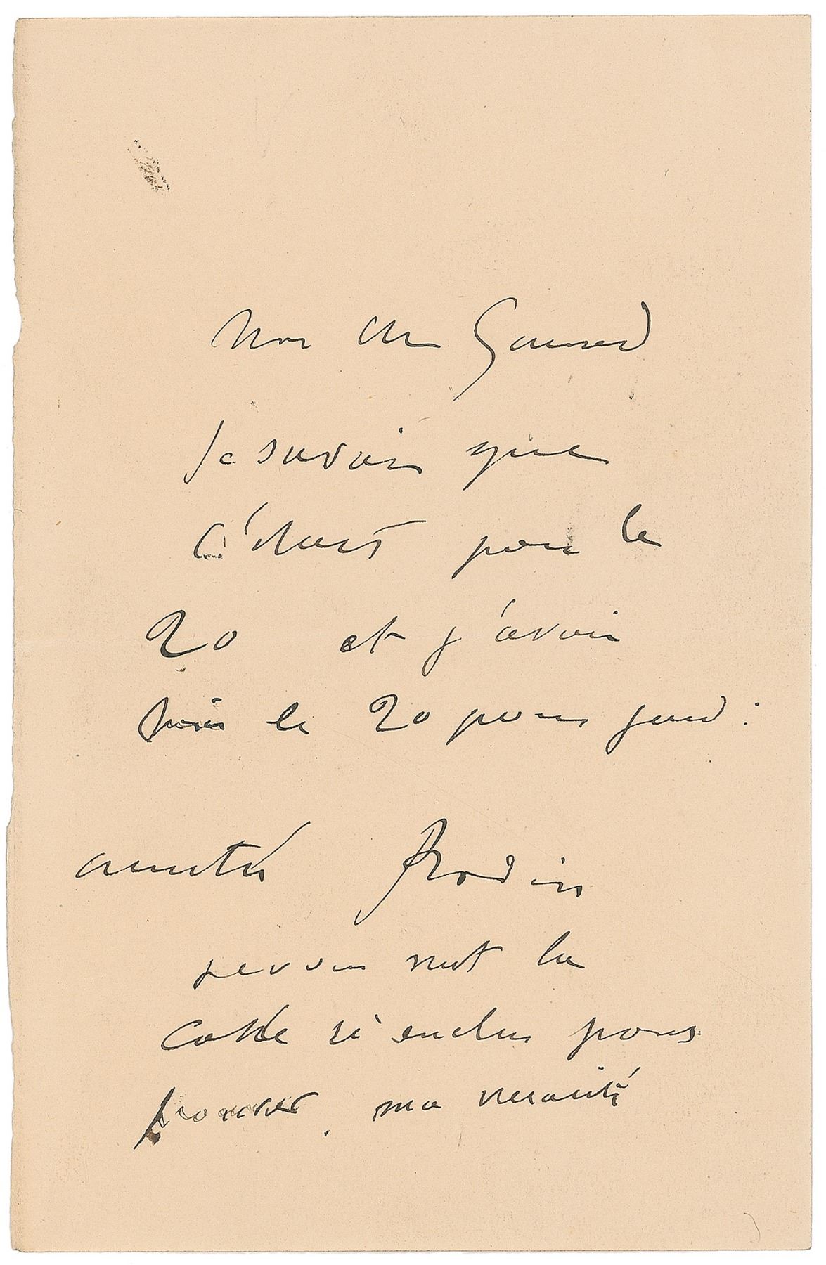 ALS in French, signed “Rodin,” one page, 4 x 6.25, no date. Letter to composer Charles Gounod. In full (translated): “I knew that it was on the 20th and I thought the 20th was Thursday…I send you the enclosed card to prove my truthfulness.” In fine condition. A desirable piece of correspondence between two persons of note.