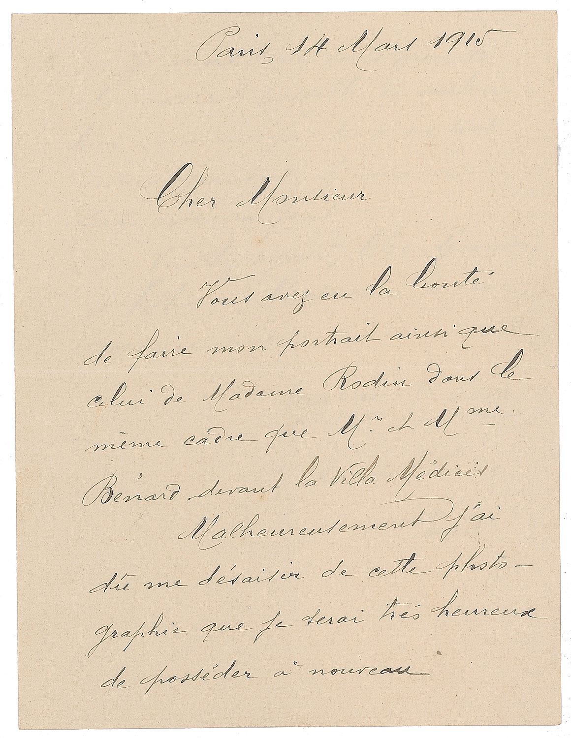 LS in French, one page, 5.25 x 7, March 14, 1915. Letter to Joseph H. Moore, discussing portraits of himself and his wife, as well as the Villa Medicis. He goes on to say (translated): "Unfortunately, I have to let this photograph go, which I will be very happy to own again. I would like to ask you if it is possible for you to send me two or three more, I would be grateful." Includes a copy of Moore's response to Rodin (written in Moore's own hand), as well as two original photographs of Rodin taken by Moore in 1914 at the Villa Medicis. In fine condition.