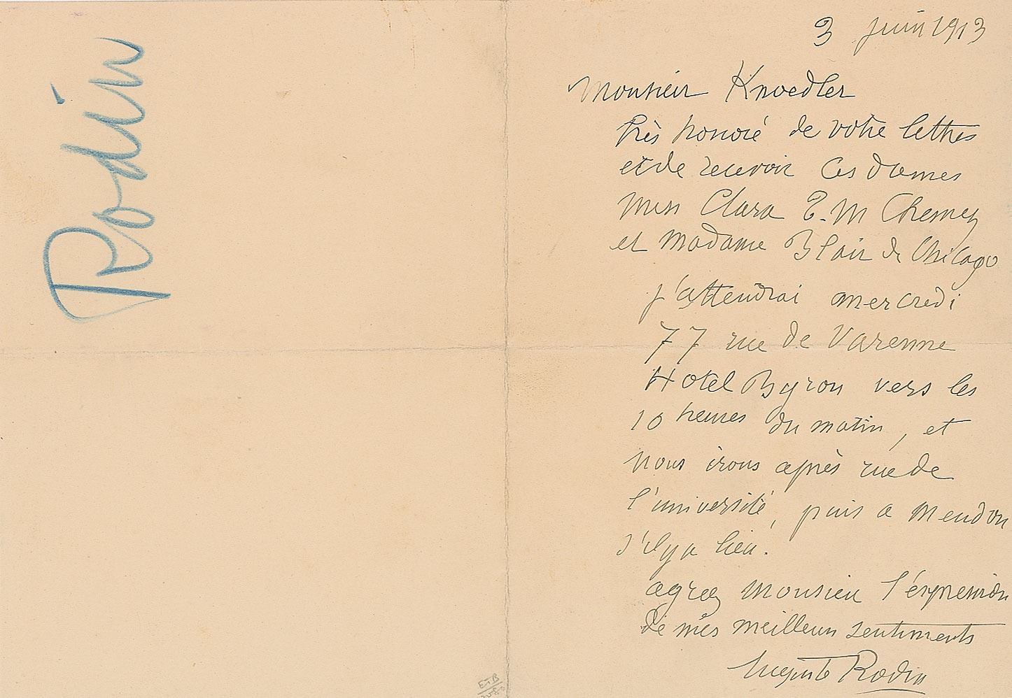 ALS in French, one page, 4.5 x 6.25, June 3, 1913. Letter to art dealer Roland Knoedler, which finds Rodin scheduling a meeting for Knoedler to purchase several of his sculptures from two women, Miss Clara Chesney and Madame Blair, in Chicago at the Byron Hotel. In fine condition. Knoedler was the proprietor of one of the oldest and most prominent art galleries in America—Michael Knoedler & Company, based in New York City.