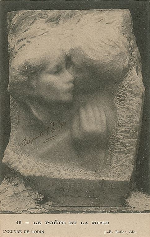 Seminal and highly lauded French sculptor (1840–1917) whose works, including the iconic ‘The Kiss’ and ‘The Thinker,’ earned him a place among the most influential artistic figures of the late 19th and early 20th centuries. Attractive 3.5 x 5.5 French postcard depicting Auguste Rodin's 1905 sculpture, 'Le Poète et la Muse,' signed in black ink. In fine condition, with moderate signature contrast.