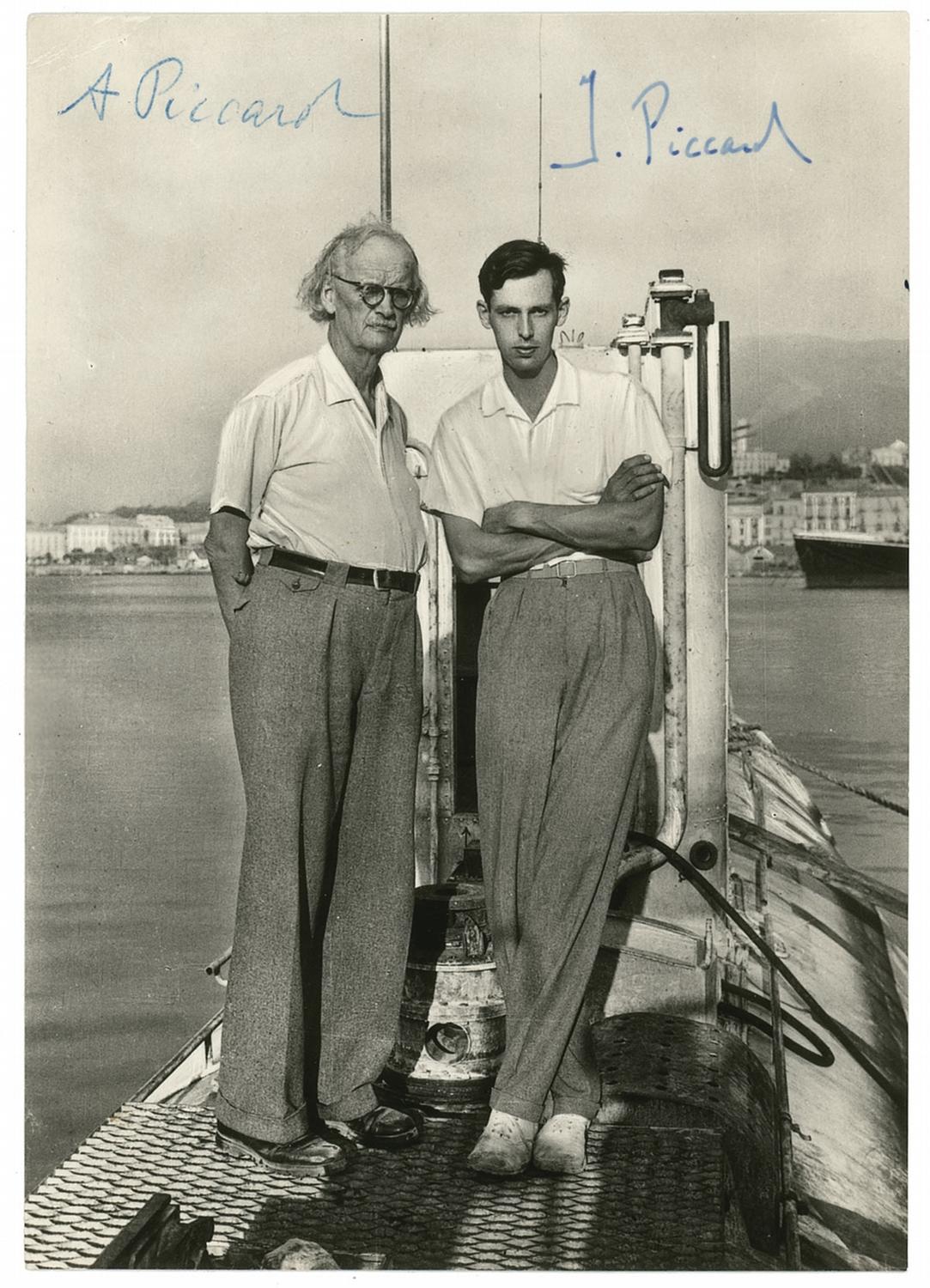 Vintage 4 x 6 postcard photo of the father and son posing atop the Trieste, signed in fountain pen by both “A. Piccard” and “J. Piccard.” Small crease to upper left corner, otherwise fine condition. Provenance: The Barry Hoffman Collection.