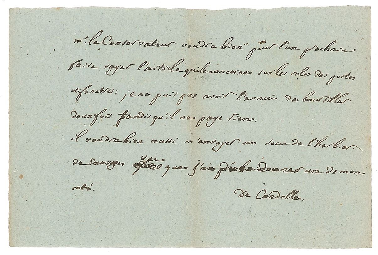 ALS in French, signed “De Candolle,” one page, 7 x 4.5, no date. Letter to the curator of a museum, in part (translated): "For next year, Mr. Curator will kindly have his entry on the roles of doors and windows crossed out; I cannot have the trouble…twice while the work is paid nothing. He will also kindly send me…the wildflower herbarium." In very good to fine condition, with light creasing, and faint toning along the central vertical fold.