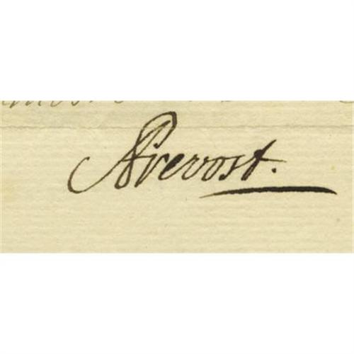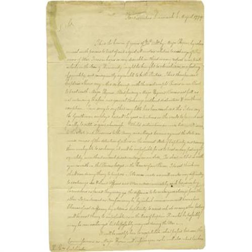 <B>Augustine Prevost Manuscript Letter Signed</B></I> <I>"A Prevost,"</B></I> 1.5 pages, 8" x 12.75", front and verso. Head Quarters, Savannah, August 1, 1779. To General Benjamin Lincoln. In part, <I>"I had the honour of yours of the 20th ulto by Major Hyrne, by whose arrival with powers to treat of and adjust all matters relative to exchange of Prisoners of War. I was in hopes so very desirable an Object in every respect, more particularly on the Score of Humanity, might be brought to a Conclusion, on a footing of equality, and consequently agreeable to both Parties. I had therefore sent Captain Shaw my Aid de Camp with the most ample Powers on our Part to treat with Major Hyrne. But finding Major Hyrne's Powers not full as not intending to a fair and general Exchange without distinction & without exception. I am sorry to say that very little has been concluded tho' I dare say the Gentleman employ'd had all the good intentions in the world to forward and finally to settle so good a business. Whilst distinctions are made between Prisoners to the State and Prisoners to the Army, and alleged Crimes against the State are made causes of the detention of others in the severest State of Captivity and deeming them uneligible to exchange, it will be impossible for us to treat on any footing of equality…"</B></I> Major Edmund M. Hyrne was the Commissary of Prisoners. In the winter of 1778, British General Henry Clinton ordered Brigadier General Augustine Prevost to invade Georgia. In January 1779, the British captured Savannah. Major General Benjamin Lincoln, recently appointed Southern commander of the Continental Army, realized that the loss of Savannah was key and set out to regain the coastal Georgia port. A month after this letter was written, on September 16, 1779, British forces at Savannah under Prevost's command came under siege by a combined force of Americans led by General Lincoln and Frenchmen led by naval commander Jean Baptiste Hector d'Estaing. On October 20th, the siege was abandoned and the British remained in Georgia until 1782. A tear at the upper left has been repaired with glassine and there are nicks and stains at the top edge. There is minor separation at two folds. Overall, the letter is in fine condition.<BR><BR><b>Shipping:</b> Flat Material, Small (<a target="_blank" href="http://www.heritageauctions.com/common/shipping.php">view shipping information</a>)