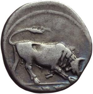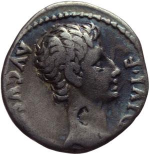 Impero Romano. Augusto (27 a.C-14 d.C). Denario, Lugdunum. D/ AVGVSTVS DIVI F. Testa nuda a destra. R/ Toro cozzante a destra. In esergo: IMP X. RIC 167a. AG. g. 3.66 mm. 17.50 Contromarca al D/, altrimenti BB.