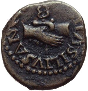 Impero Romano. Augusto (27 a.C-14 d.C). Quadrante, 9 a.C. D/ LAMIA SILIVS ANNIVS. Due mani che si stringono su caduceo. R/ III VIR AAA FF intorno a grande SC. RIC 420. AE. g. 3.24 mm. 17.00 BB. Patina cuoio.