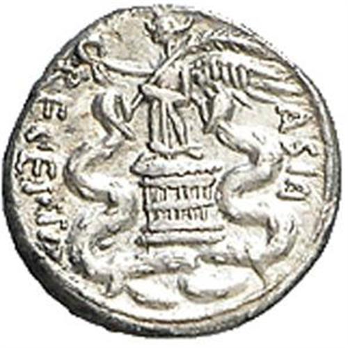 Impero Romano. Augusto (27 a.C.-14 d.C.). Quinario, 29-27 a.C. D/ [CAESAR] IMP VII. Testa nuda a destra. R/ ASIA RECEPTA. La Vittoria stante a sinistra su cista mistica, tra due serpenti eretti. RIC 276. gr. 1.69 AG. qSPL. Contromarche al D/, altrimenti.