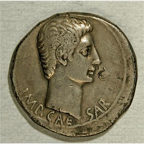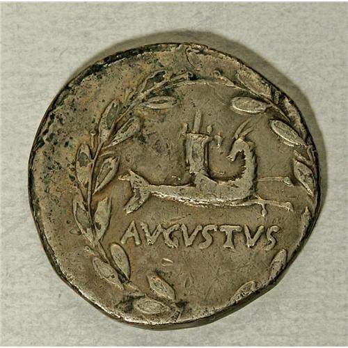 <B>Augustus.</B></I> 27 B.C.-A.D. 14. AR cistophoric tetradrachm (26 mm, 11.56 g). Ephesus, ca. 25 B.C. Bare head right / Capricorn swimming right, bearing cornucopiae; all within oak wreath. RIC 477; Sutherland Group V; RSC 16. <B>Toned VF,</B></I> mark before face, porosity.<BR><BR><b>Shipping:</b> Coin/Currency (<a target="_blank" href="http://www.heritageauctions.com/common/shipping.php">view shipping information</a>)