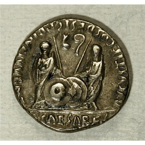 <B>Augustus.</B></I> 27 B.C.-A.D. 14. AR denarius (17 mm, 3.61 g). Lugdunum, 2 B.C.-A.D. 14. Laureate head right / Gaius and Lucius Caesars standing facing, resting hands on clipei between them; spears behind; simpulum facing right and lituus facing left in field above. RIC 207; BMC 519; RSC 43. <B>VF,</B></I> surfaces a little rough.<BR><BR><b>Shipping:</b> Coin/Currency (<a target="_blank" href="http://www.heritageauctions.com/common/shipping.php">view shipping information</a>)