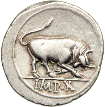 Augustus, 27 BC-AD 14. AR Denarius struck at Lugdunum, 15-13 BC. Bare head right of Augustus. Reverse: Bull butting right. RIC 167a; BMC 451. Lovely portrait, well centered on a large flan; Choice Very Fine.