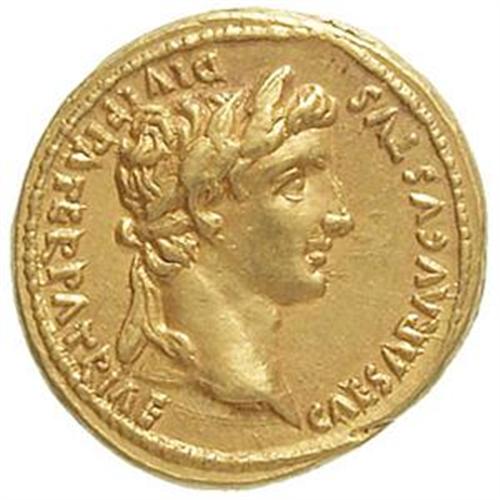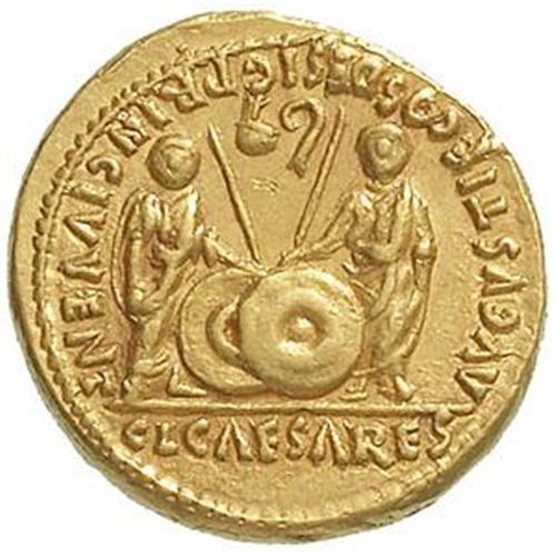 Roman Empire Coins. Augustus (27 a.C. - 14 d.C.). Aureo, Lugdunum. D/ CAESAR AVGVSTVS DIVI F PATER PATRIAE. Testa laureata a destra. R/ C L CAESARES AVGVSTI F COS DESIG PRINC IVVENT. Gaio e Lucio Cesari stanti di fronte con lance e scudi. Tra le loro teste, simpulum e lituus. RIC 206. gr. 8.05 RR. AU. SPL.