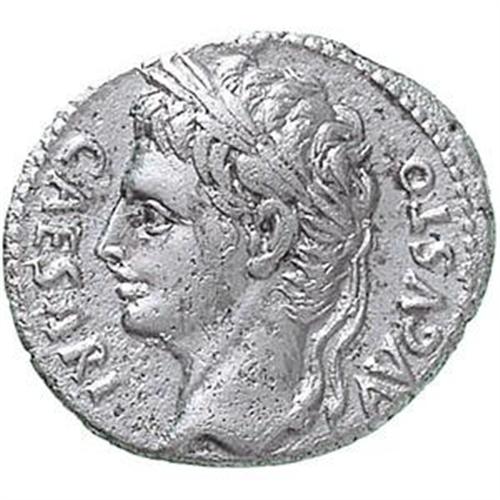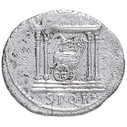 Roman Empire Coins. Augustus (27 a.C. - 14 d.C.). Denarius. D/ CAESARI AVGVSTO. Testa laureata a sinistra. R/ All'interno di tempio tetrastilo, cocchio sormontato da aquila romana e piccola quadriga. In esergo: SPQR. RIC 117. gr. 3.68 R. AG. Porosit, altrimenti bel BB+.