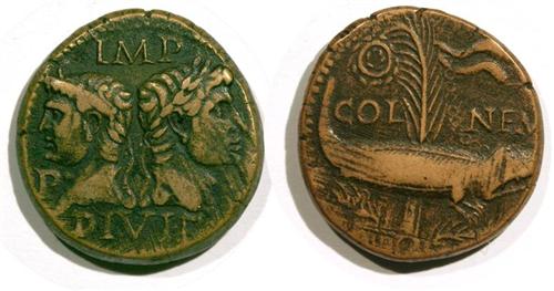 Dupondius of Nemausus in Gaul. Head of Augustus & Agrippa back to back. Reverse; crocodile chained to palm #S1731.