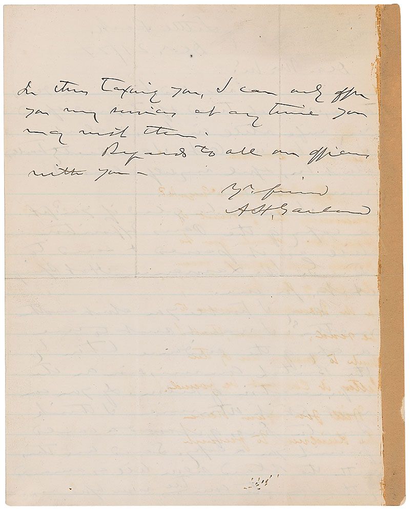 Politician from Arkansas (1832–1899) who served as his state’s Confederate States senator, governor, and United States senator before becoming the attorney general during the Cleveland administration. ALS, one lined page both sides, 7.75 x 9.75, December 21, 1877. Letter to Senator John McPherson. In part: “I reached home in due time, much tired & fatigued & found my wife still in bed, & almost as I left her in Oct. I am greatly troubled about her, & I feel myself almost unmarried…I would be glad if you’d get a copy of the Paris Exposition bill as it passed & send to Dr. G. W. Lawrence, Hot Springs Arks. for me. May I trouble you about another matter? I want sent to me a copy of the evidence taken by the British Commission on the Depreciation of Silver. If you can not get it entre nous, I think Senator Jones of Nevada could furnish you a copy. Send me this with the Bland Silver bill as amended by the Senate Committee now before us. In thus taxing you, I can only offer you my services at any time.” In very good condition, with intersecting folds, light scattered creases, mounting remnants to the right border of the reverse, and a few spots of soiling.