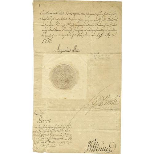 <B>Augustus III of Poland Document Signed</B></I> "<I>Augustus Rex</B></I>" as king and elector, four pages in German, 8" x 13.75", April 29, 1753, n.p., with a full paper seal. Augustus III (1696-1763), King of Poland and Elector of Saxony, was, as Frederick Augustus II, the Elector of Saxony 1733-1763, and also King of Poland 1734 - 1764. Also known as Augstus the Saxon or the Corpulent, he was the son of August II the Strong. He was groomed to succeed his father as King of the Polish-Lithuanian Commonwealth, and thus converted to Catholicism. After his father's death, he inherited Saxony and was elected King of Poland with the support of Russian and Austrian military forces in the War of the Polish Succession (1733-1738). As King, August III was uninterested in the affairs of his Polish-Lithuanian dominion, focusing on interests like hunting, opera, and collecting paintings. During his 30-year reign, he spent less than a total of three years in Poland fostering internal political anarchy and further weakening the Polish-Lithuanian Commonwealth. In fine condition. <BR><BR><b>Shipping:</b> Flat Material, Small (<a target="_blank" href="http://www.heritageauctions.com/common/shipping.php">view shipping information</a>)