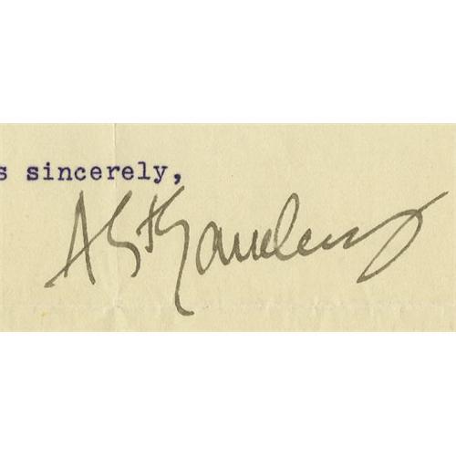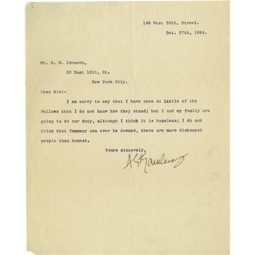 <B>Augustus Saint-Gaudens Typed Letter Signed</B></I> "<I>A St Gaudens</B></I>". One page, New York City, October 27, 1894, to Mr. R.U. Johnson, New York City. It reads in full: "Dear Sir:- I am sorry to say that I have seen so little of the fellows that I do not know how they stand; but I and my family are going to do our duty, although I think it is hopeless; I do not think that Tammany can ever be downed, there are more dishonest people than honest. Yours sincerely,". St. Gaudens was perhaps the most famous American public sculptor of the late 19th century. Among his more memorable projects are the Robert Gould Shaw monument in Boston, the William T. Sherman monument in New York City and, of course, the bold design found on $20 gold coins minted between 1907 and 1933. Even light toning, minor loss to two corners. Fine condition.