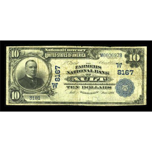 <B>Ault, CO</B></I> - $10 1902 Date Back Fr. 617 <B>The Farmers NB</B></I> Ch. # (W)8167<BR> A very rare bank in large size, with this piece one of just three recorded in the census. It has been off the market since our consignor obtained it in a 1996 auction. <B>Very Good+.</B></I><BR><BR><b>Shipping:</b> Coins & Currency (<a target="_blank" href="http://www.heritageauctions.com/common/shipping.php">view shipping information</a>)