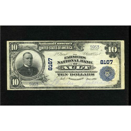 <B>Ault, CO</B></I> - $10 1902 Plain Back Fr. 626 <B>The Farmers NB</B></I> Ch. # 8167<BR>A most significant Colorado discovery, as this piece, which is new to the market, is only the third large note to surface from this just plain rare bank. It's the first time in at least a decade that any large note has been available from here, and, just as important, this is by a huge margin the highest grade piece of the trio. Expect some stiff competition before the hammer falls on this lot tonight. <B>Very Fine.</B></I>