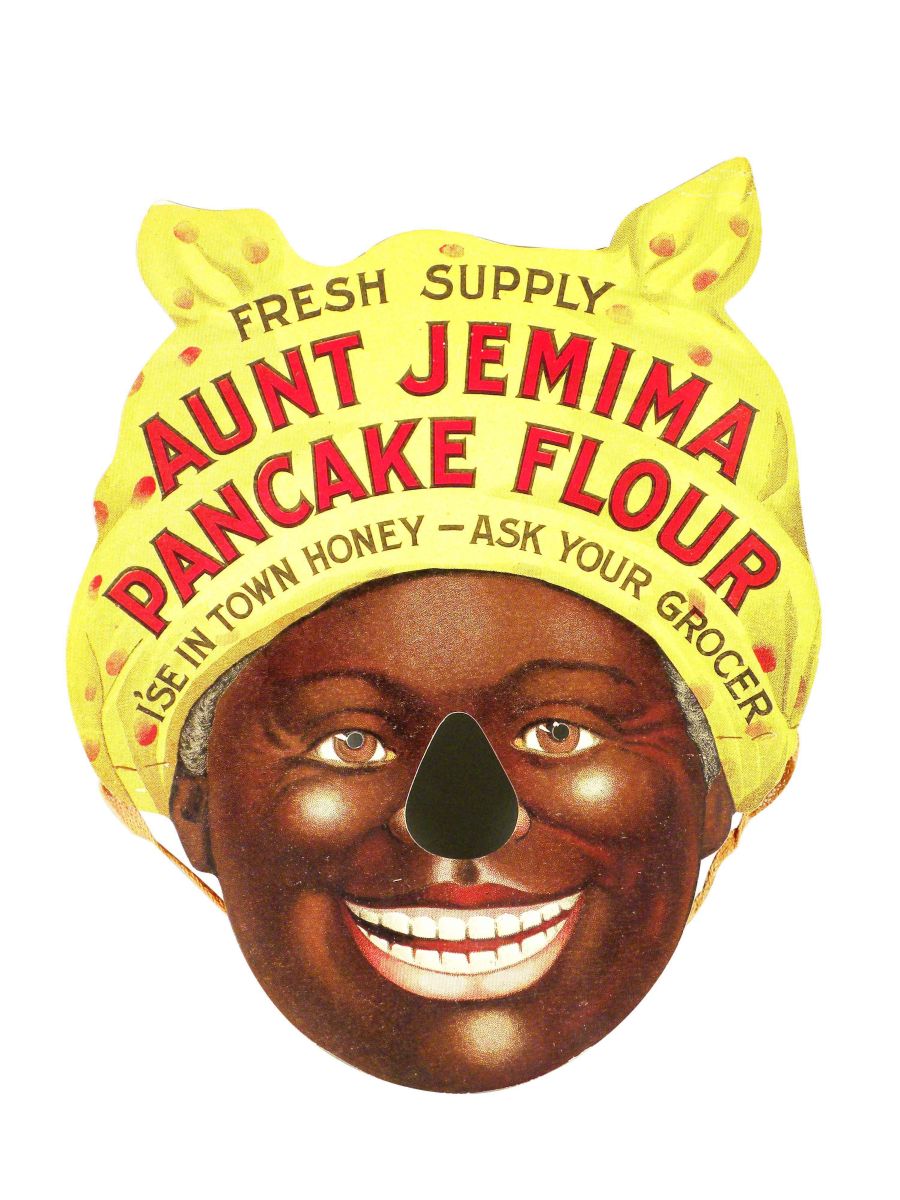 Aunt Jemima Pancake Flour Cardboard Mask. The Davis Milling Company, St. Joseph, MO. Advertising on front and back. Slight dog ear bandana otherwise very good condition. 9 1/4 X 11 1/4 inches.