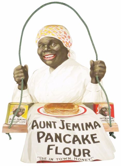 Very Rare Aunt Jemima Pancake Flour Die Cut Cardboard String Hanging Sign. Tape repair at center fold and small tear under A in Jemima otherwise very good condition. 9 1/4 X 14 inches.