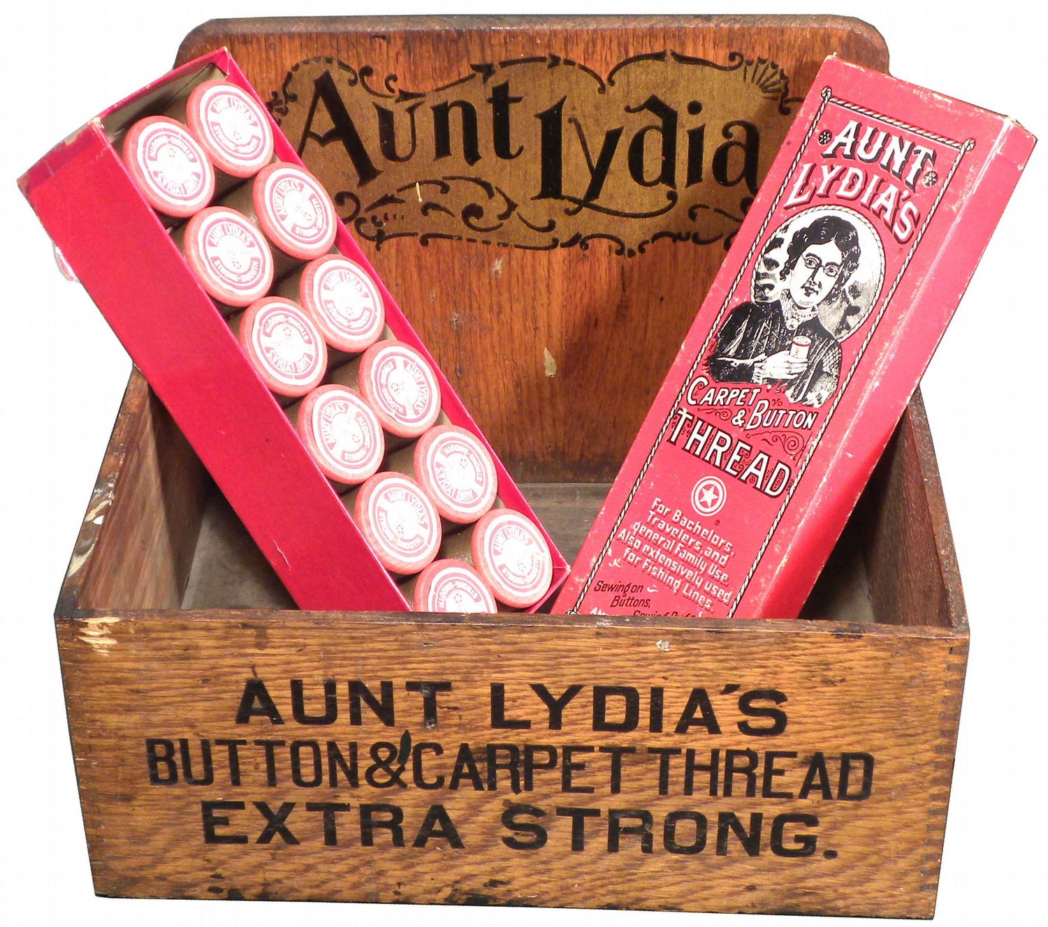 Aunt Lydia's Button & Carpet Thread Store Display. All wood, comes with full box of Aunt Lydia's Thread. Thread box in near mint condition, wood display is excellent condition. 11 X 8 1/2 X 9 1/2 inches.
