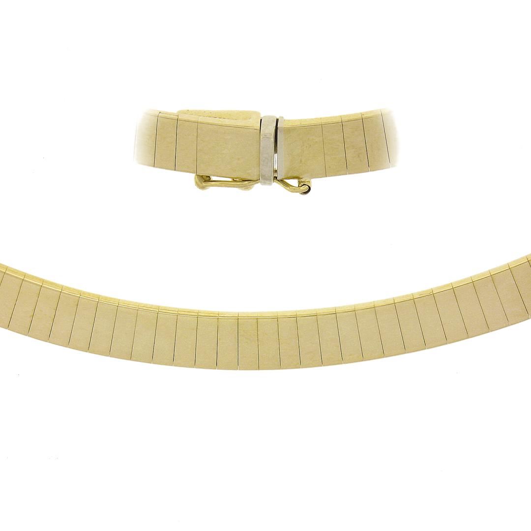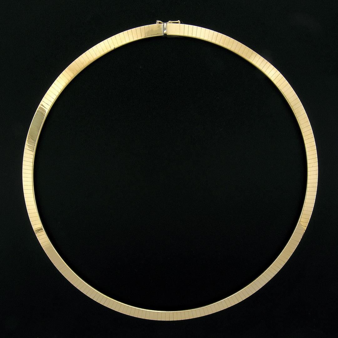 A solid 14k yellow gold omega link necklace by Aurafin. It weighs a total of 35.15 grams, measures 6mm wide, and measures 15.5 inches in length.