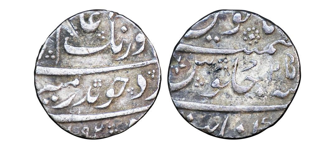 Aurangzeb (AH 1068-1118, 1658-1707 AD), Set of 2 coins, Silver 1/2 Rupee, 5.64 gms, Khambayat Mint, AH 1092, RY 25, very fine, rare.