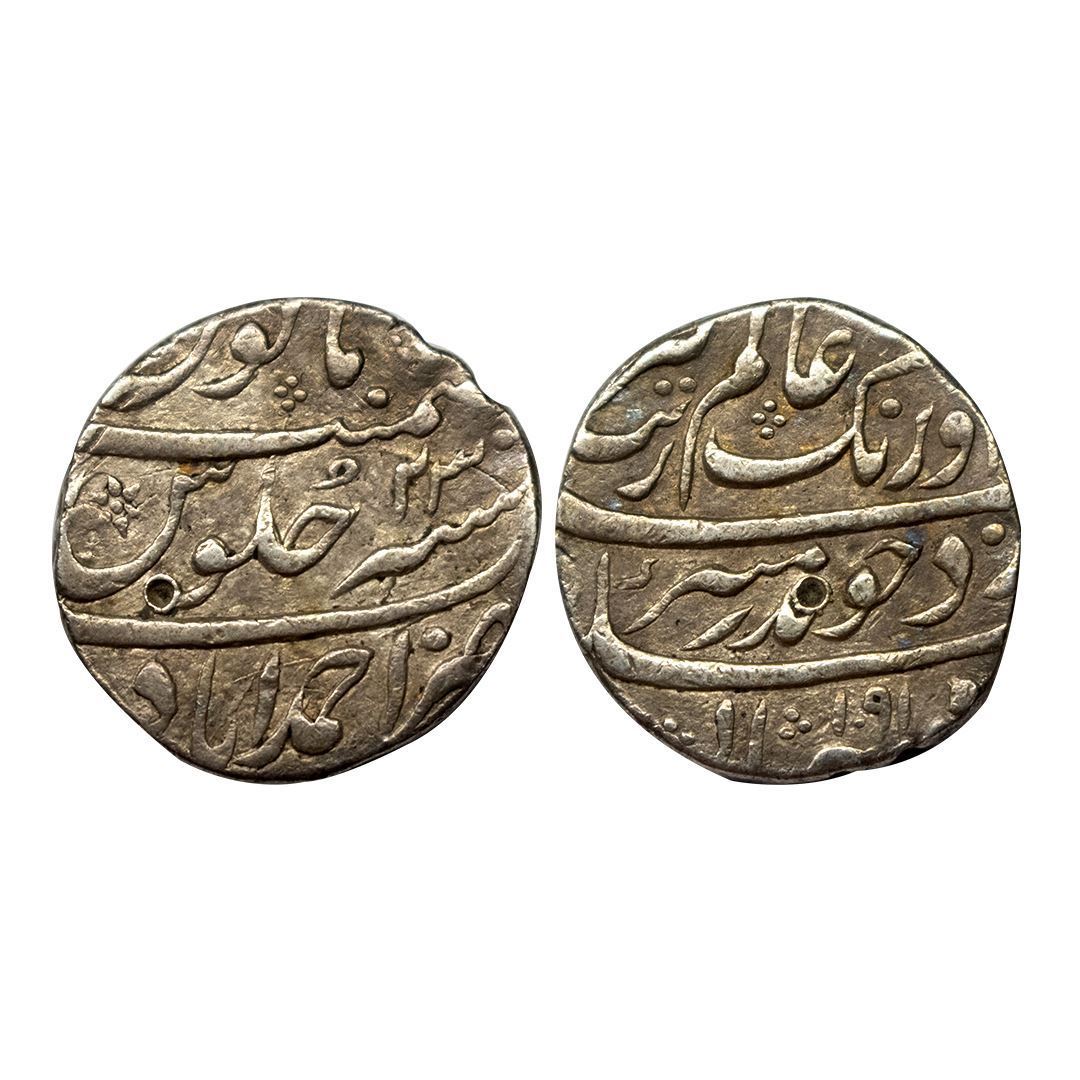 Aurangzeb, Rupee, Ahmedabad Mint, Silver, Badr Munir type. Complete Mint name in the bottom line on rev, AH 1091, RY 23. Test Marks, Very Fine.