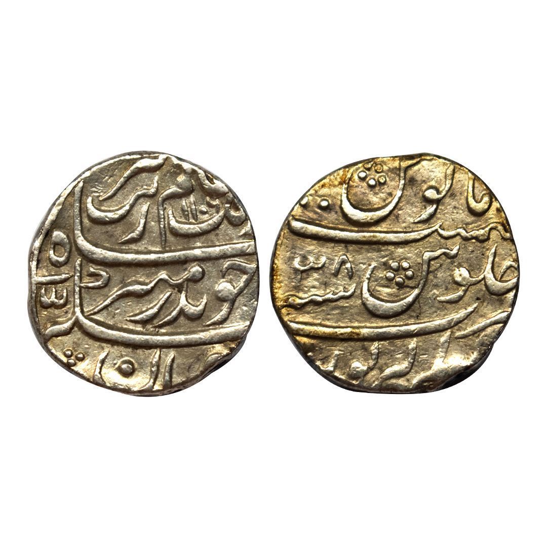 Aurangzeb, Rupee, Alamgirpur Mint, Silver, Badr Munir type. Complete Mint name in the bottom line on rev, AH 1106, RY 38. Test Marks, Very Fine, Rare.