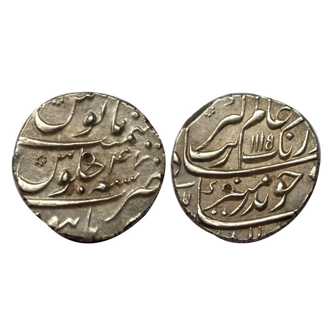 Aurangzeb, Rupee, Burhanpur Mint, Silver, Badr Munir type. Mint name in the bottom line on rev, AH 1115, RY 47. Test Marks, Almost UNC, Rare.