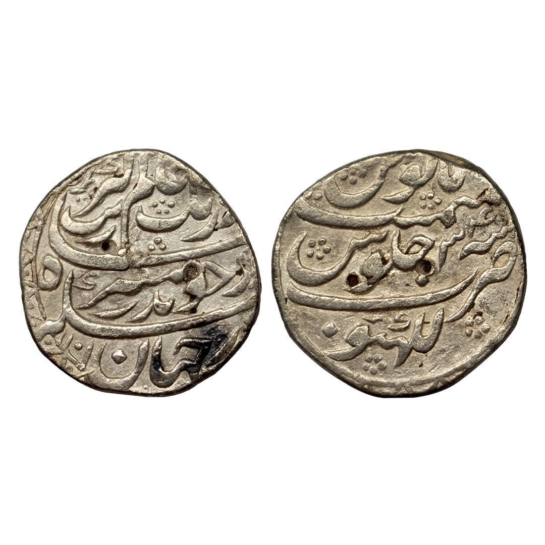Aurangzeb, Rupee, Lakhnau Mint, Silver, Badr Munir type. Complete Mint name in the bottom line on rev, AH 1101, RY 34. Dumpier flan with crude and thicker calligraphy, Test Marks, About Extremely Fine+.
