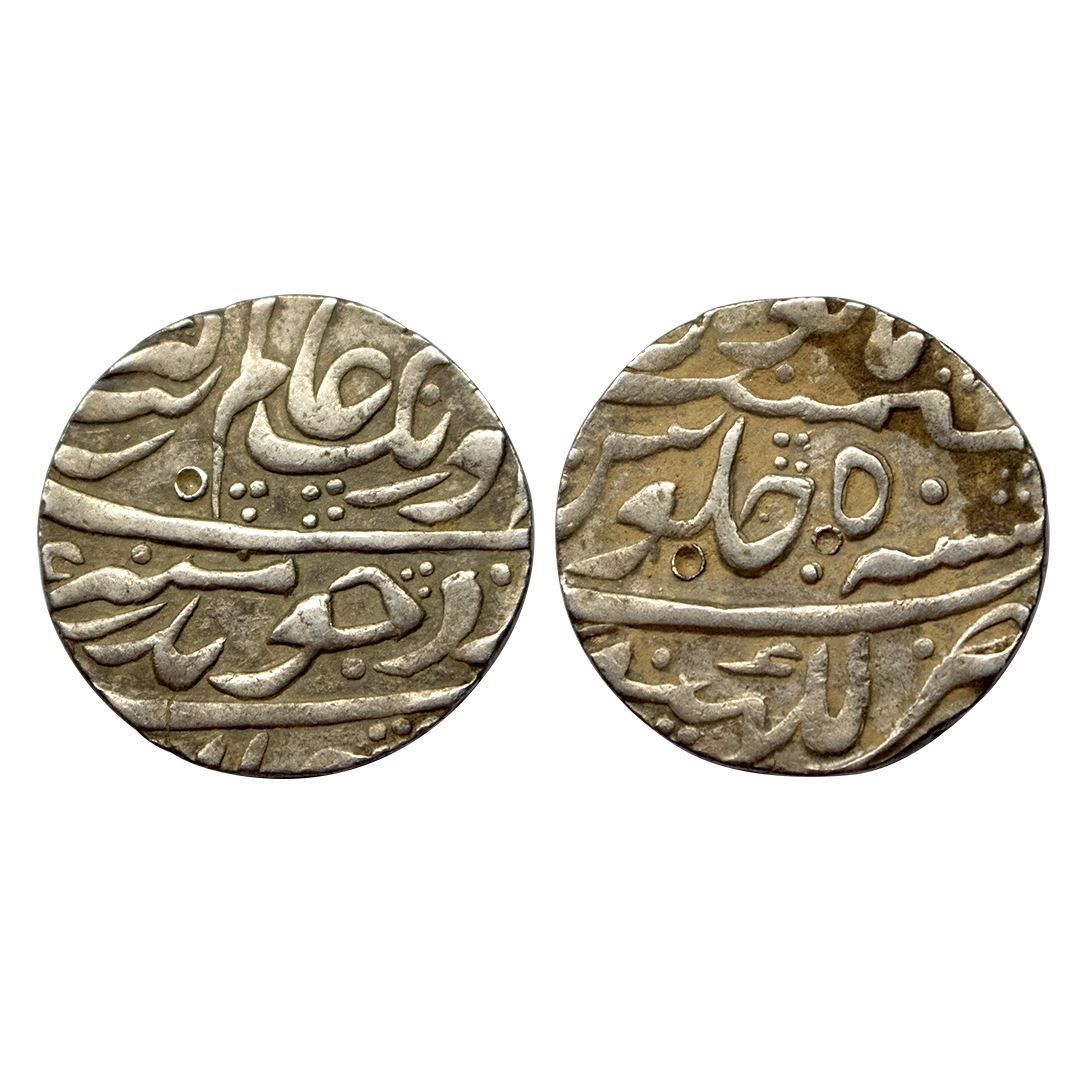 Aurangzeb, Rupee, Lakhnau Mint, Silver, Badr Munir type. Complete Mint name in the bottom line on rev, AH ND, RY 50. Last year of issue, Broader flan with crude and thicker calligraphy, Test Marks, Very Fine+.