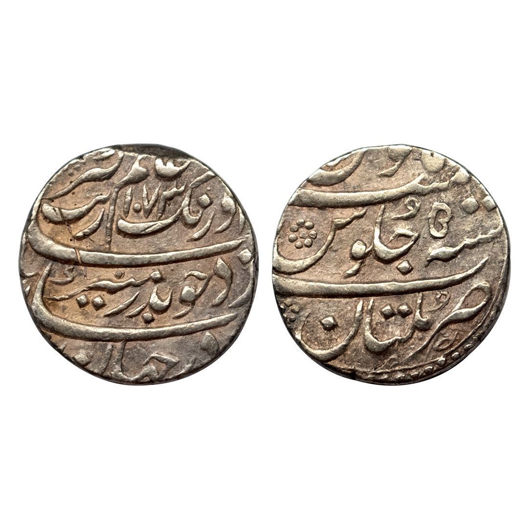 Aurangzeb, Rupee, Multan Mint, Silver, Badr Munir type. Complete Mint name in the bottom line on rev, AH 1073, RY 5. Test Marks, About Extremely Fine, Scarce.
