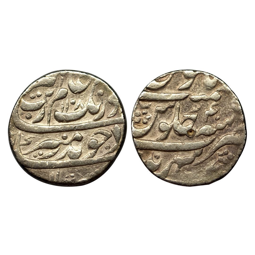 Aurangzeb, Rupee, Sahrind Mint, Silver, Badr Munir type. Mint name in the bottom line on rev, AH 110