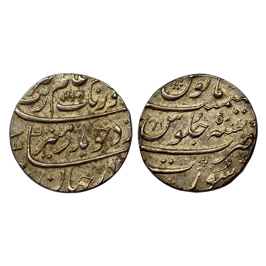 Aurangzeb, Rupee, Surat Mint, Silver, Badr Munir type. Complete Mint name in the bottom line on rev, AH 1118, RY 50, the second-last year of issue. No Test Marks, Almost UNC.