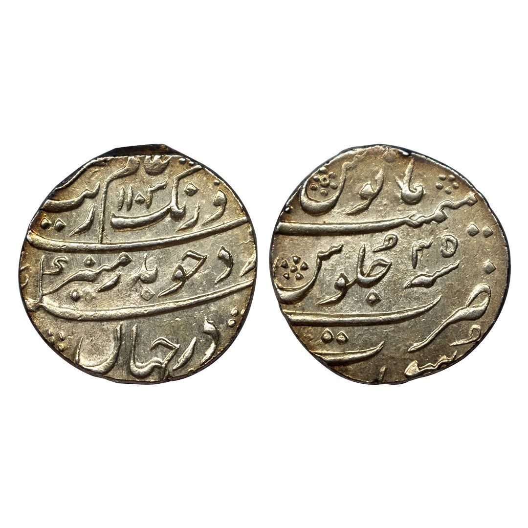 Aurangzeb, Rupee, Surat Mint, Silver, Badr Munir type. Mint name in the bottom line on rev, AH 1103, RY 35. No Test Marks, Almost UNC.