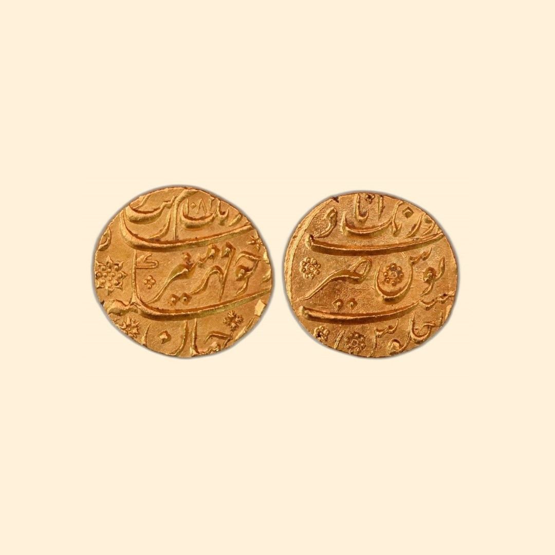 Aurangzeb (AH 1068-1118 / 1658-1707 AD), Gold Mohur, 10.97gms, Aurangabad Mint, AH 1084, Mehr-i-Munir couplet, mint name on rev top area. (KM # 315.10).about Uncirculated, rare