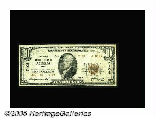 <B>Aurelia, IA</B></I> - $10 1929 Ty. 2 <B>The First NB</B></I> Ch. # 7108<BR>This <B>Very Fine</B></I> example is one of but two documented of the $10 Type 2 from the only one of the two issuing banks in town to order the Type 2 variety.