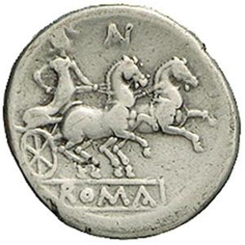 Aurelius. Denario, 194-190 a.C. D/ Testa di Roma a destra. Dietro, X. R/ Diana in biga a destra. Sopra, monogramma AV. In esergo: ROMA. Cr. 136/1. B. 1. gr. 3.86 NC. AG. qBB.