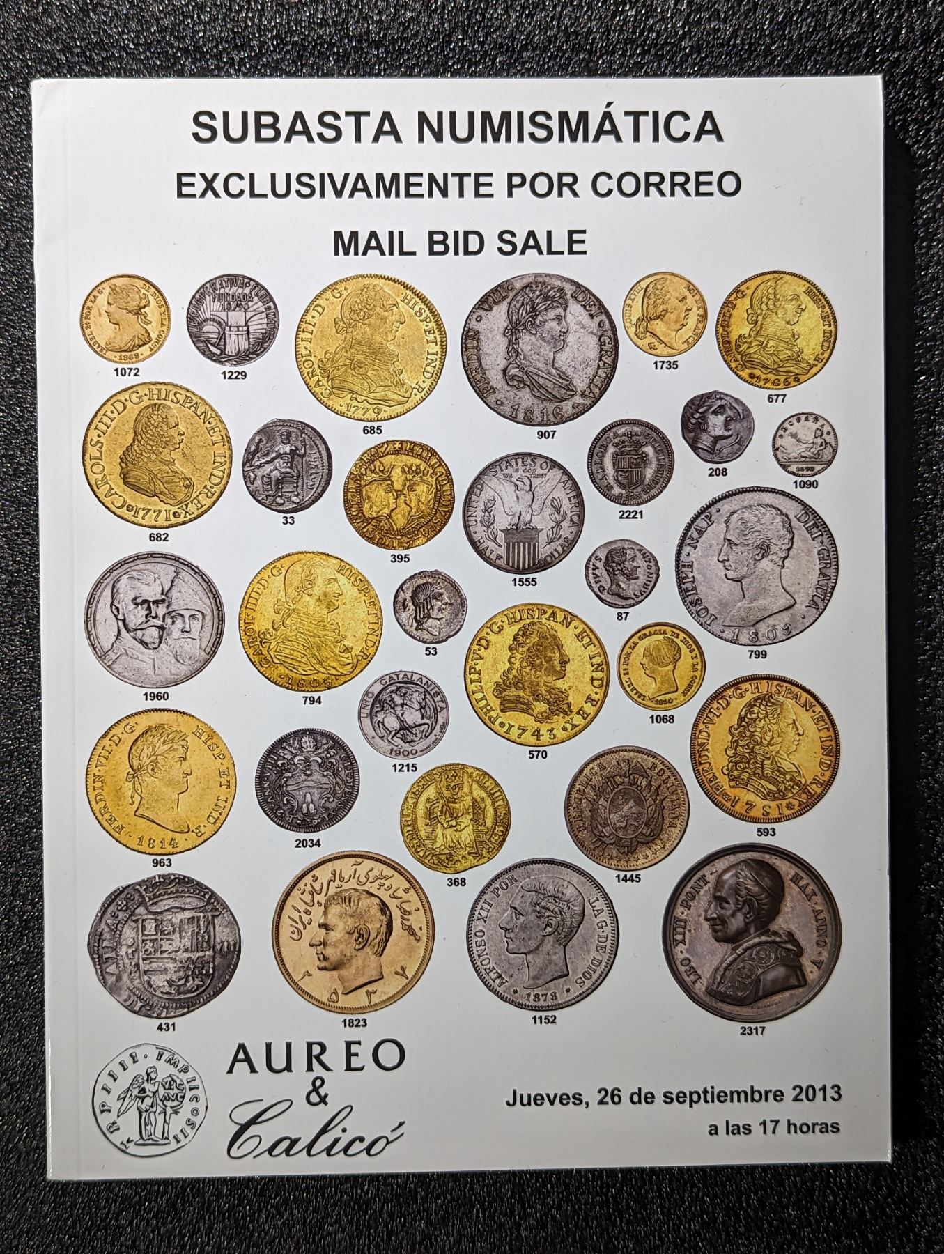Aureo & Calico. SUBASTA NUMISMATICA. September 26, 2013. 4to. 1-2700 Lots. Original pictorial card covers. Mail Bid Sale. Sale 254. Barcelona. 183 Pages. color coin, medal and currency photos throughout. Fine. Lot weight: 1 lbs 9oz. Subject(s): Ancient, Spanish, Spanish American, World Coinage, Paper Money.