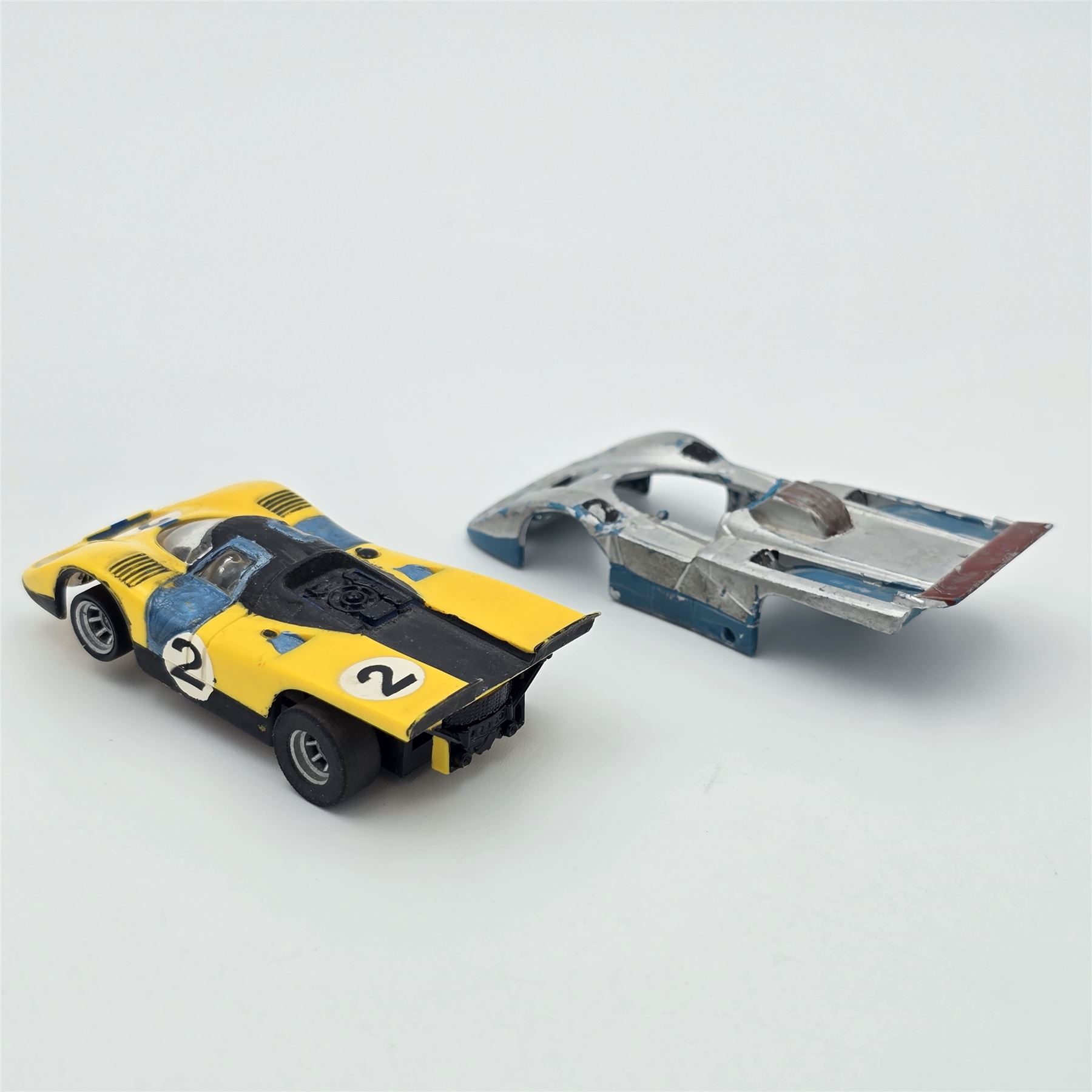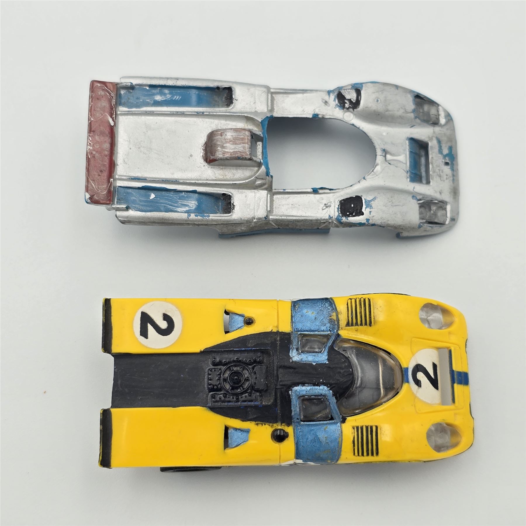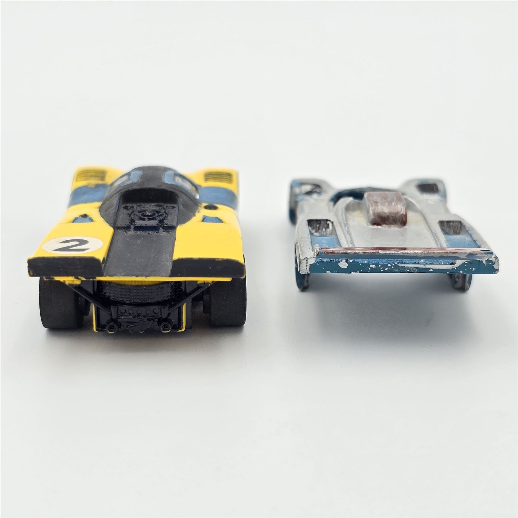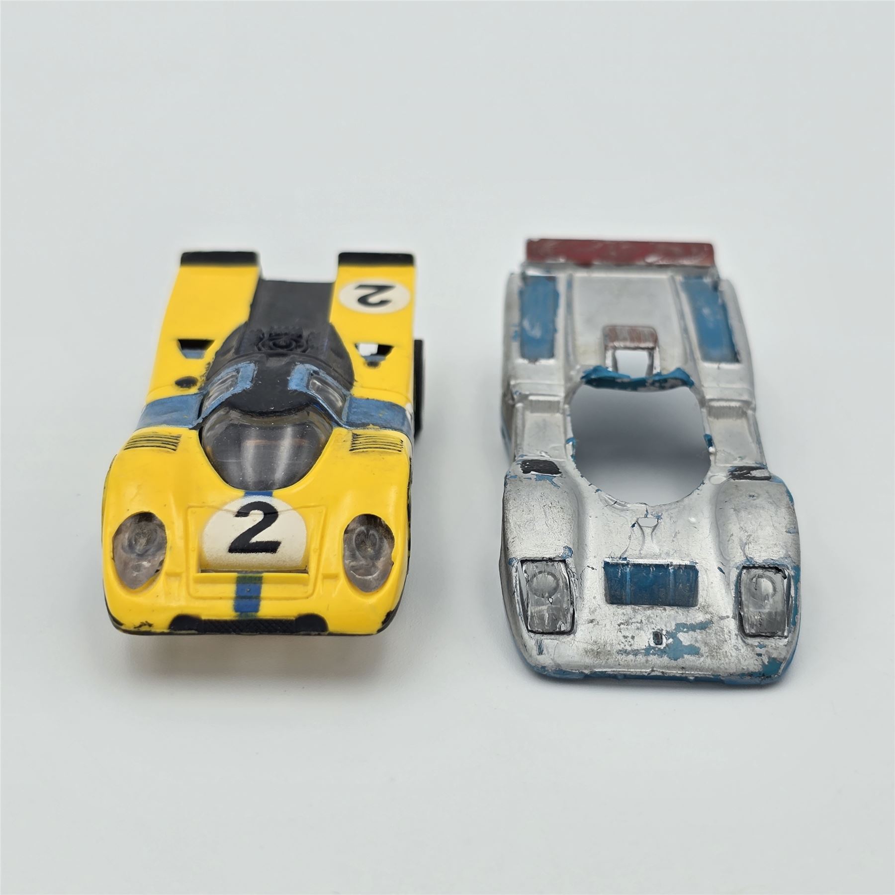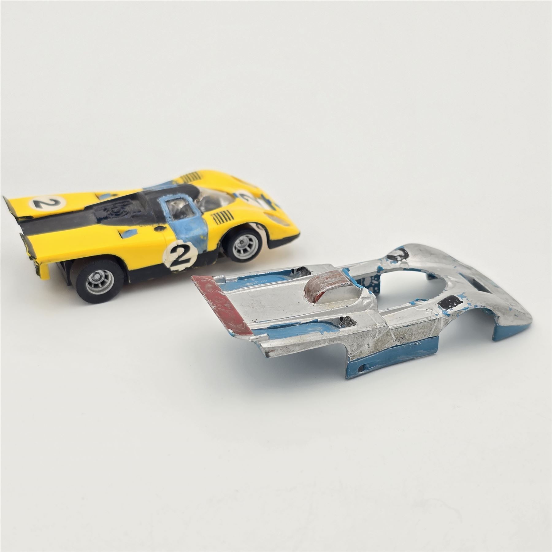 Cars: Porsche 917 appears to be in good condition with kid painted details all around, the Ferrari 512M is just the body, no glass and has been kid painted as seen