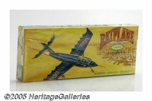 <B>Aurora Batplane Model Kit in Original Shrink Wrap (Aurora, 1966).</B></I> In the mid 1960s, the campy TV classic "Batman" was all the rage. Tapping into this enthusiasm, Aurora Models produced a series of kits inspired by the show and the DC Comics. One such kit was the Batplane, which was originally released in 1966 and has been rare on the collector's market for over 40 years. This kit is still sealed in its original packaging, and is in Excellent condition.