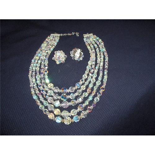 CRYSTAL AURORA BOREALIS 5 STRAND NECKLACE AND EARRINGS, EXCELLENT...</em></td>