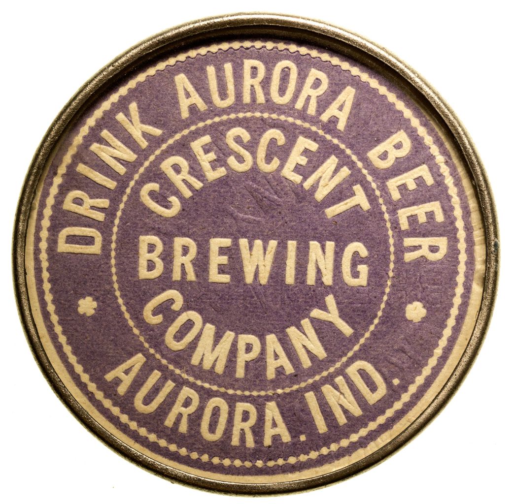 Advertising | “Mirror in encased in a 5mm thick metallic ring. Imbedded in the ring are the obverse image and reverse mirror. The obverse is white text on purple backing under glass protector. The reverse side is the mirror which is in very good condition.” | Drink Aurora Beer/ Aurora. Ind/ Crescent/ Brewing/ Company| Aurora Crescent Brewing Company | Overall in very good condition |Aurora, IN