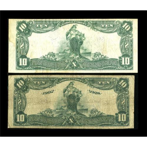 <B>Aurora, IL</B></I> - $10 1902 Date Back Fr. 616 <B>The Aurora NB</B></I> Ch. # 2945<BR><B>Aurora, IL</B></I> - $10 1902 Plain Back Fr. 624 <B>The Aurora NB</B></I> Ch. # 2945<BR> The $10 DB is well circulated grading <B>Fine</B></I> and the $10 PB grades <B>VF/XF</B></I> with a hint of staining.<BR><BR><b>Shipping:</b> Coins & Currency (<a target="_blank" href="http://www.heritageauctions.com/common/shipping.php">view shipping information</a>)